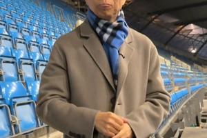 詹俊提前踩场,佩戴主场蓝色系的围巾。詹俊介绍,咪咕的待遇比天空电视台的还要“高”。