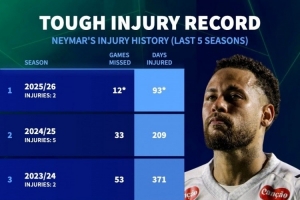 内马尔近5个赛季伤病情况: